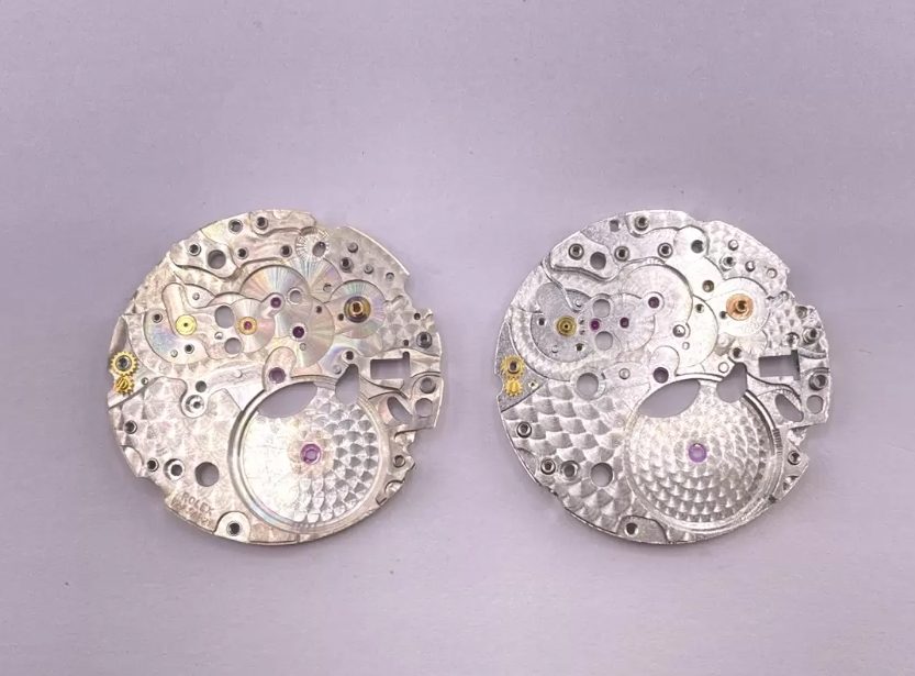 왼쪽: (정품) - 오른쪽: (상하이 4131)4131 무브먼트는 상하이 4130에서 제작됩니다. 무브먼트의 연삭/전기도금/조각/조립은 C공장에서 독립적으로 완료됩니다.그러니까 엄밀히 말하면 4131 상하이 무브먼트는 상하이와 클린의 협력으로 완성된 것입니다.이전 상하이 4130에는 무브먼트 안정성/타이밍 기능을 0으로 되돌릴 수 없음/무브먼트의 거친 연마…