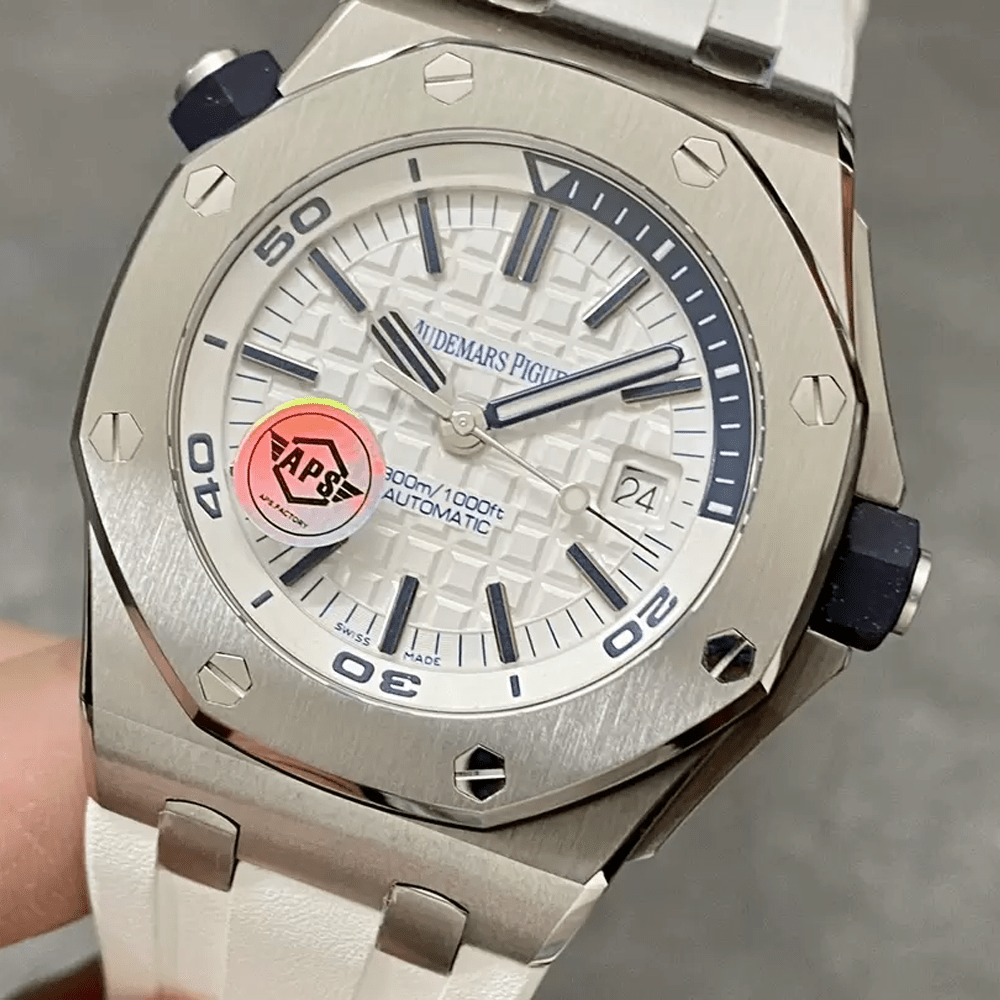 오데마피게 로얄오크 오프쇼어 다이버 화이트 텍스처 다이얼 SS 화이트 러버 스트랩 42mm 15710