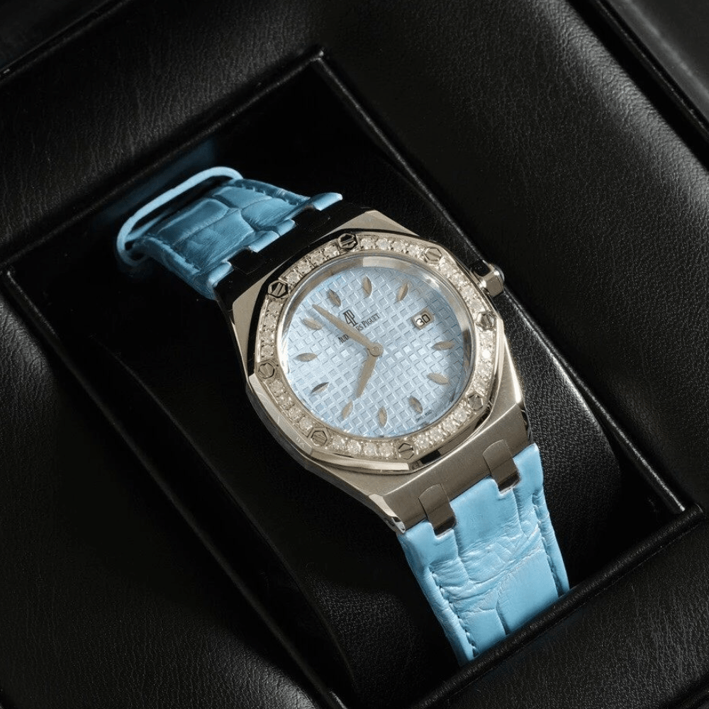 오데마피게 레이디 로얄오크 블루 텍스처 다이얼 다이아베젤 악어가죽 스트랩 33mm 67601ST
