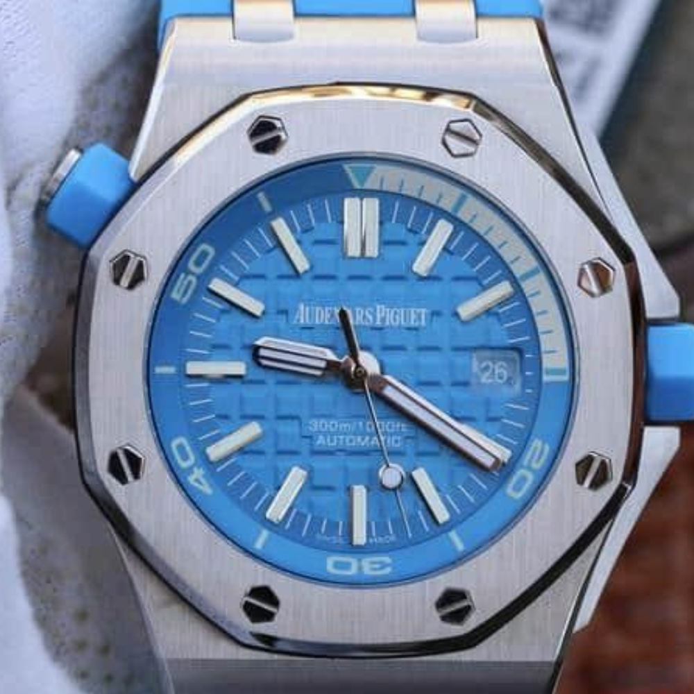 오데마 피게 V8 로얄 오크 15710ST, 2017년 새로운 여름 컬러 시리즈, 3120 복제 케이스 크기: 42mm. 케이스 두께: 14.1mm. "Méga Tapisserie" 오버사이즈 체크무늬 장식, 화이트 골드 형광 3차원 아워 마커 및 로얄 오크 핸즈, 다이빙 스케일이 있는 블루 회전 베젤, 옐로우 0~15분 표시 영역, 무반사 사파이어 크리스털 미러 소재. 방수 수심: 300m