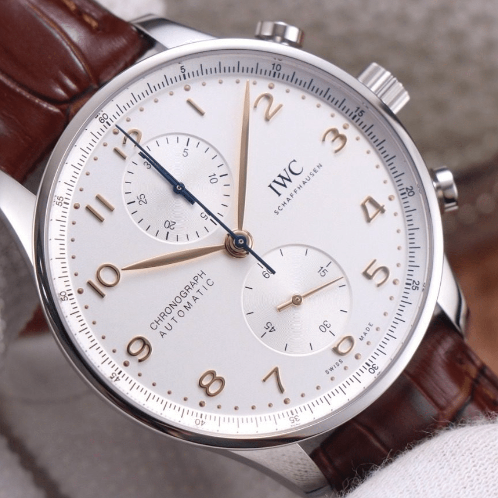 IWC 포르투기저 크로노그래프 화이트골드 화이트 다이얼 레더 스트랩 41mm IW371604
