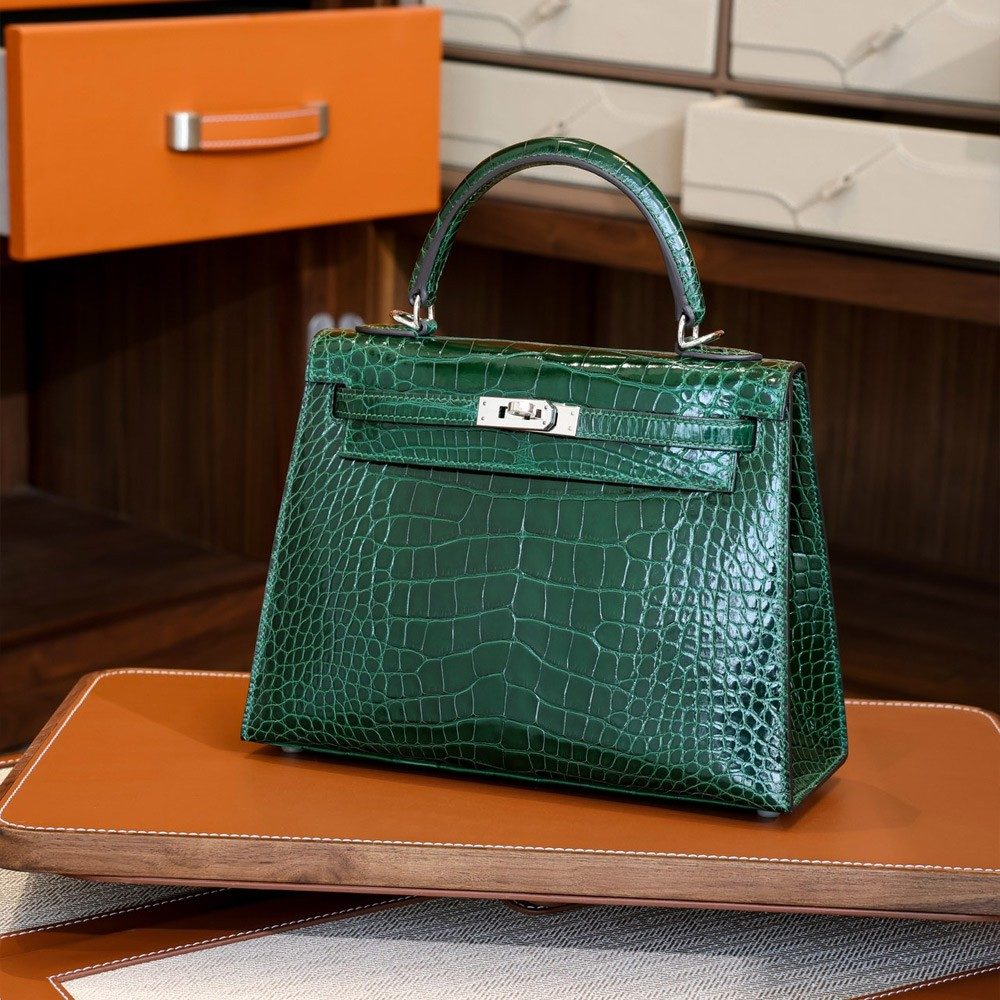 에르메스 올수공 엘리게이터 켈리 25 그린 팔라듐 하드웨어