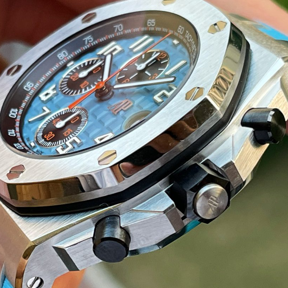 오데마피게 로얄오크 오프쇼어 크노로그래프 블루 다이얼 SS 블루 러버 스트랩 42mm 26238TI