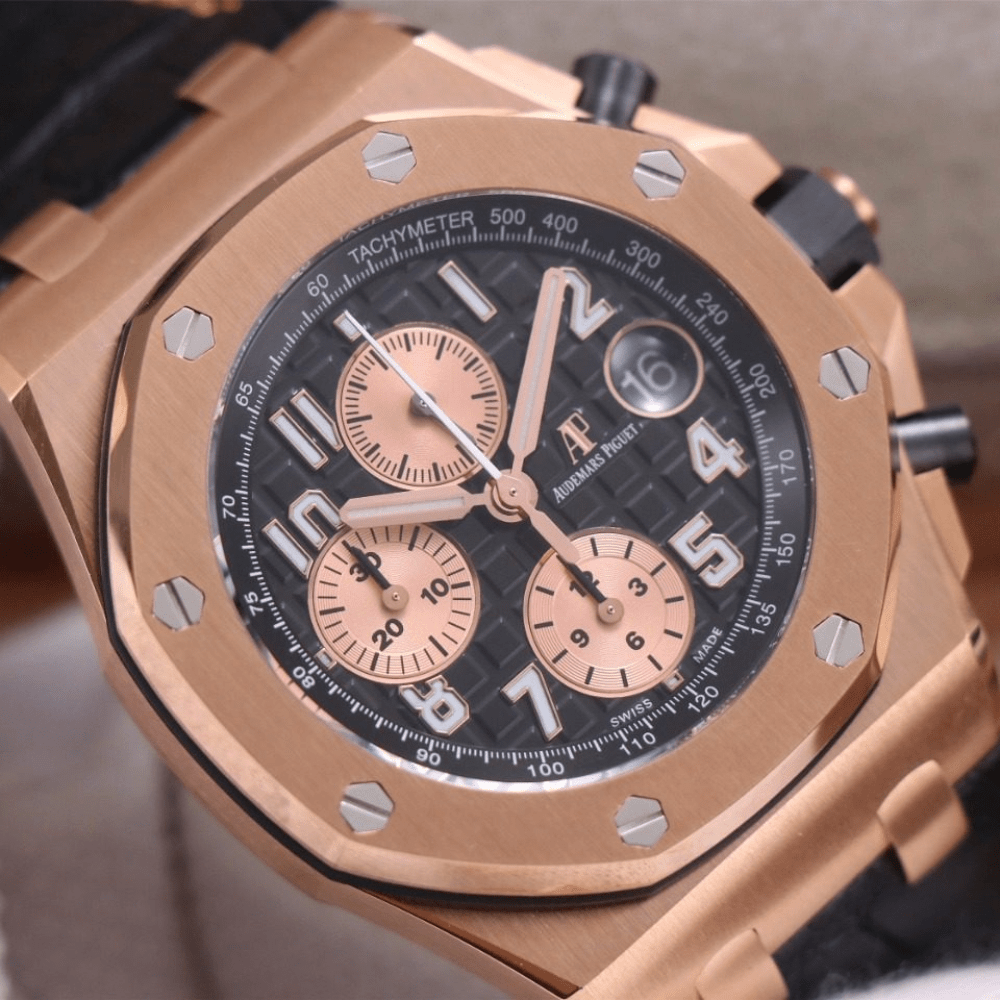 JF AP 로열 오크 오프쇼어 26470 OR 풀 로즈 골드 세라믹 크로노그래프(가죽 스트랩). 직경 42mm! 오리지널 Cal.3126 12자리 크로노그래프 무브먼트의 복제품이 탑재되었습니다!