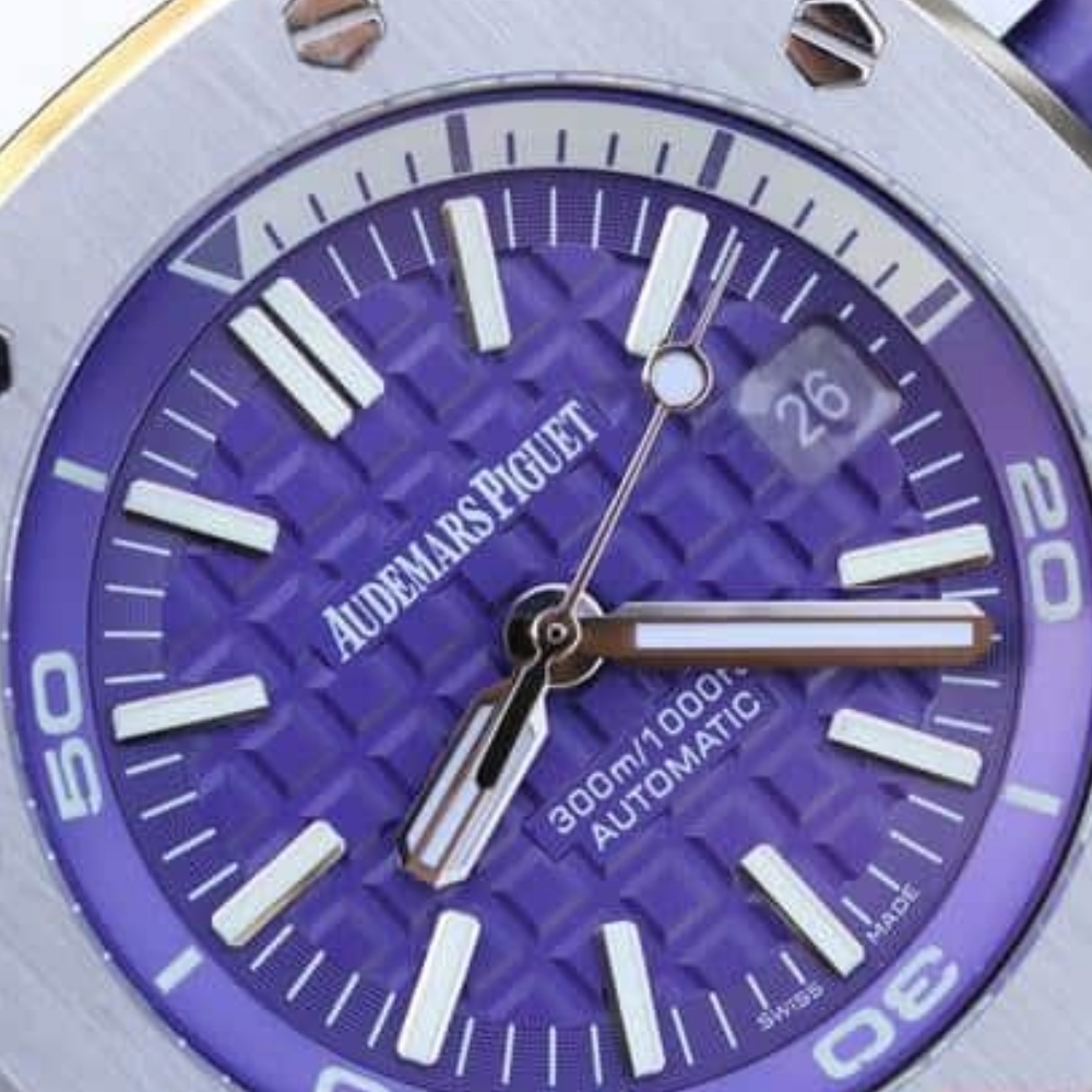 오데마 피게 로얄 오크 15710ST v8, 2017년 새로운 여름 컬러 시리즈, 클론 3120 케이스 크기: 42mm. 케이스 두께: 14.1mm. "Méga Tapisserie" 오버사이즈 체크무늬 장식, 화이트 골드 형광 3차원 아워 마커 및 로얄 오크 핸즈, 다이빙 스케일이 있는 블루 회전 베젤, 옐로우 0~15분 표시 영역, 무브먼트 소재: 눈부심 방지 사파이어 크리스털. 방수 수심: 300m