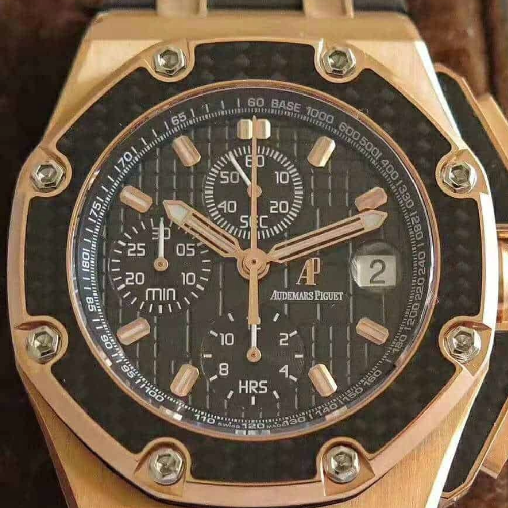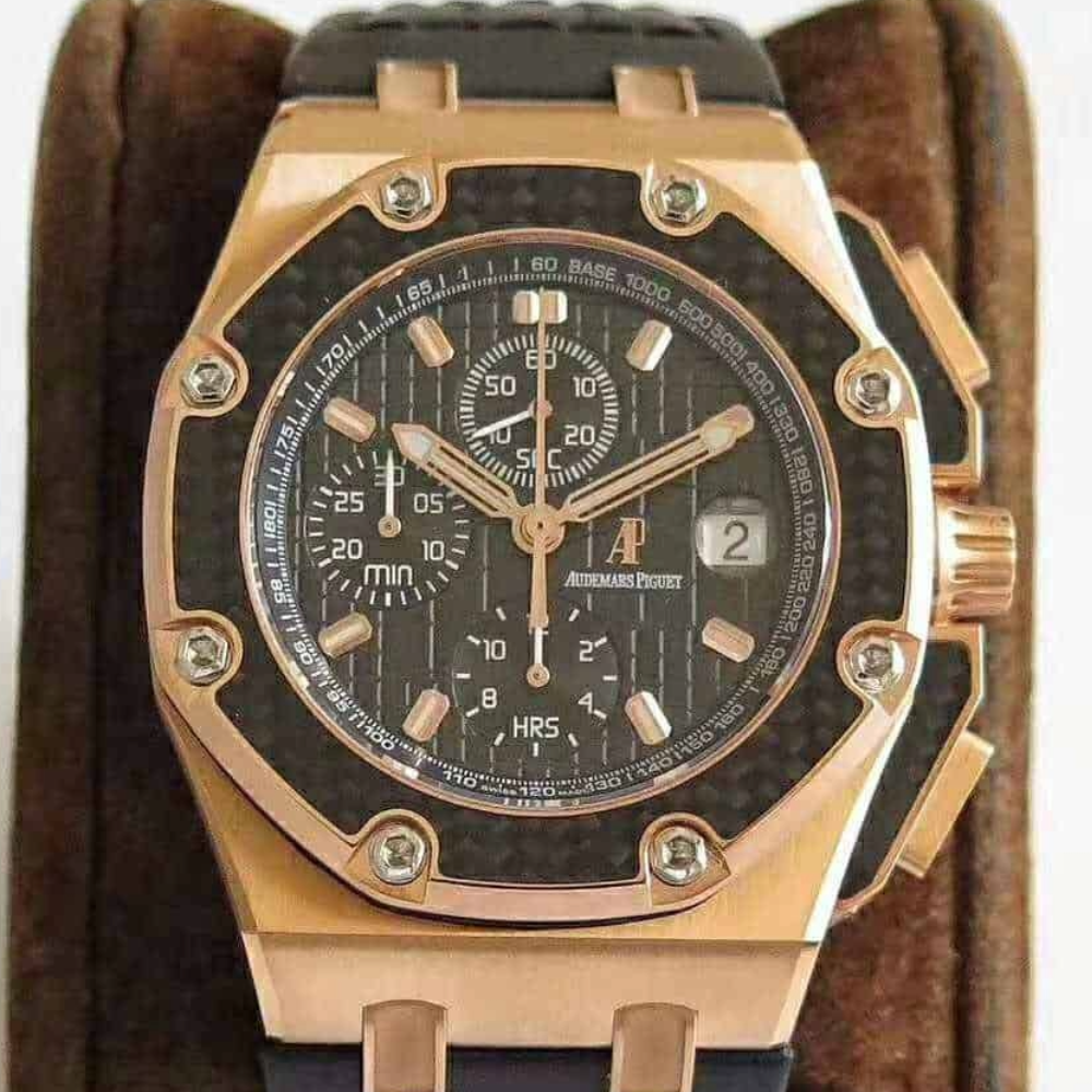오데마피게 로얄오크 오프쇼어 블랙 다이얼 사파이어 로즈골드 몬토야 한정판 가죽 스트랩 44mm 26030