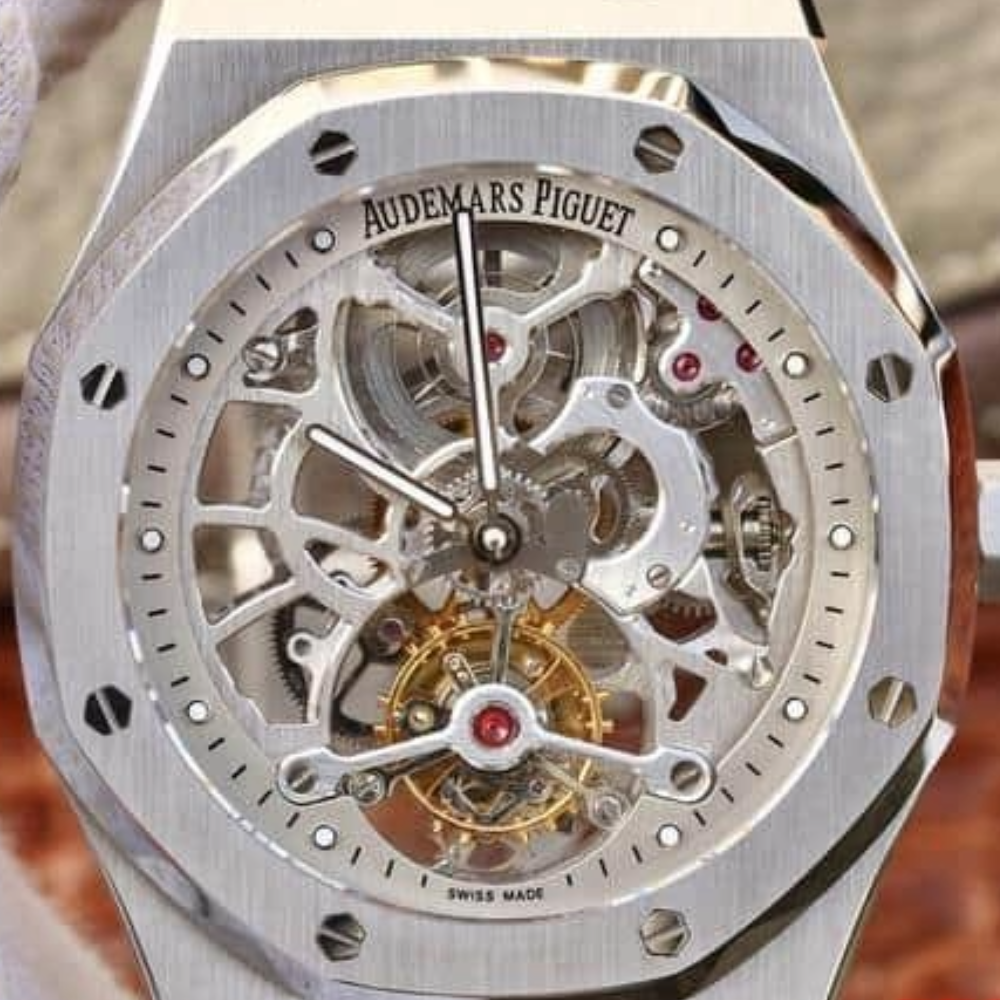 V2 업그레이드 로열 오크 26518 트루 투르비용 남성용 시계. 장인정신이 깃든 이 시계는 미세한 차이만으로도 무브먼트의 정확도나 충격 방지 효과에 영향을 미칠 수 있습니다. 2924 데이트 80 데이트 케이스 직경 41mm, 12.4mm. 1930년대, 오데마 피게는 이미 정교한 중공 장식 기술을 습득했으며, 오늘날까지도 전통적인 장인정신을 고수하고 있습니다. 줄질, 장식, 그리고 최종 장식 연마를 통해 오데마 피게는 정교한 중공 장식 기술을 완성해 왔습니다.
