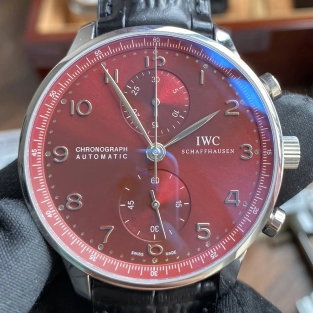 IWC 포르투기저 크로노그래프 레드 다이얼 150주년 기념 에디션 레더 스트랩 40mm IW371616