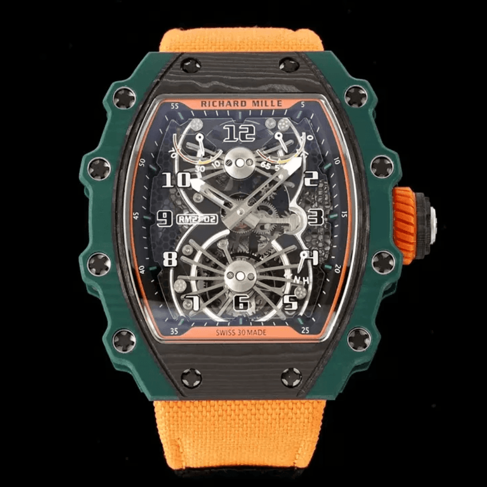 리차드밀 블랙 카본 스켈레톤 투르비옹 다이얼 오렌지 우븐 스트랩 RM21-02
