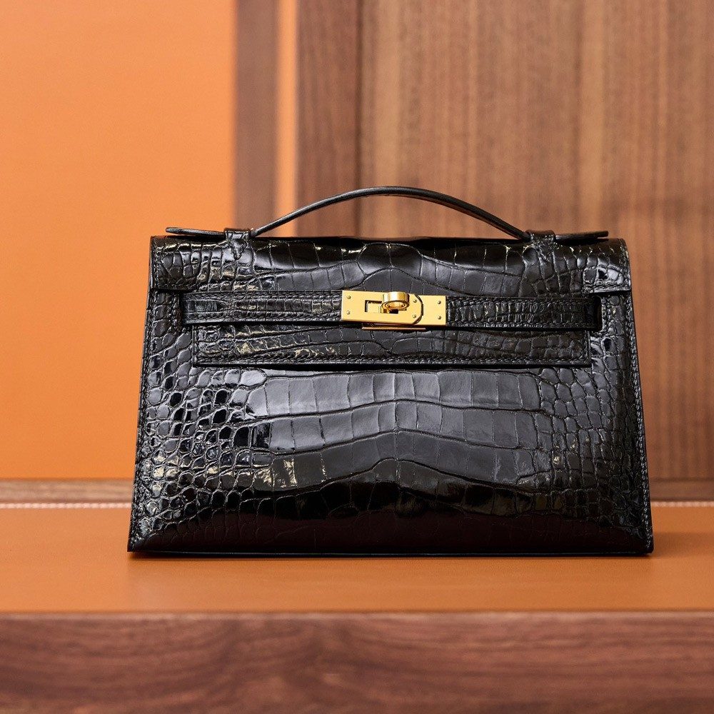 에르메스 올수공 크로커다일 미니 켈리 포쉐트 22 블랙 금장